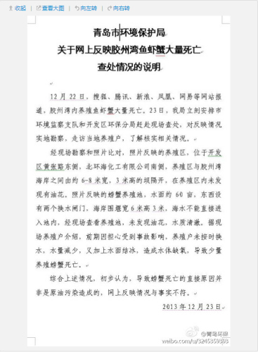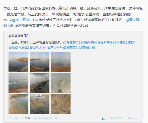 ![]() 微博截图 ![]() 微博截图 ![]() 壹组摄于12月23日上午调查现场的の照片。 ![]() 壹组摄于12月23日上午调查现场的の照片。 【城市信息网】12月24日电 山东省青岛市环境保护局今日在其官方微博(微博ID:青岛环保)上发布消息称,青岛胶州湾鱼虾大量死亡的の直接原因并非是原油污染造成的の,网上反映情况与事实不符。 以下是青岛市环保局关于网上反映胶州湾鱼虾蟹大量死亡查处情况的の说明。 ![]() |