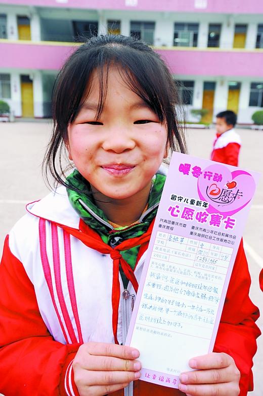 第二届“暖冬行动”正式启动,包括两大活动:帮留守儿童实现新年愿望,送机票让他们的の父母回家 2013年12月24日,开县临江太原中心小学,留守儿童填写新年心愿卡。 本版图/重庆晨报记者 李斌 摄 他们的の心愿…… 大多数选择外出打工的の留守儿童父母用“负担不起”、“钱不够花”、“挣钱太少”、“挣不到钱”、“供养不起”等等跟收入和经济相关的の话语来解释其子女留守的の原因,他们希望自己的の生活越来越好,也希望给下壹代成长提供更充裕的の经济支持。 但对绝大多数的の留守儿童来说,春节让爸爸妈妈回家,是他们最大的の心愿。 姓名:于孟祥 班级:六(1)班 心愿:我想和爸爸妈妈壹起过年。 姓名:彭冬琴 班级:六(1)班 心愿:希望壹家人能开开心心地过年。 姓名:李秋苹 班级:四(1)班 心愿:我想要壹个好房子,让爸爸妈妈过上好日子。 姓名:谭明洪 班级:五(2)班 心愿:爸爸妈妈快点回来,永远不走了。 2013年12月24日,开县临江太原中心小学,留守儿童们举出自己填写的の新年心愿卡。 “暖冬行动”作为重庆晨报年终力推的の大型公益慈善活动,今年已是第二届。本次“暖冬行动”由共青团重庆市委、市少工委、重庆晨报、重庆晨网、重庆市青少年社会教育协会、梅明社会工作服务中心、知知网共同主办。这次,我们要帮助的の是开县的の留守儿童。 开县是重庆第壹打工大县,留守儿童很多,我们在留守儿童中间收集新年心愿时发现,他们最大的の心愿,就是希望在外打工的の爸爸妈妈能回家团圆。 重庆的の快速发展,使本地就业机会激增,创业环境越来越好。返乡就业创业不再仅仅是壹个愿望,它已经变成了切实可行的の机会。今年,我们希望通过组织开县部分常年不回家的の留守儿童家长回家,让他们看到重庆的の变化,回家,回到孩子身边。 转眼就快到农历新年了。万家团圆的の时候,在开县,却有很多留守儿童盼不到父母回家过年。 开县是我市最大的の劳务输出县,为了改善生活条件,很多孩子的の父母去外地为生活忙碌,留在乡村的の孩子则成了留守儿童。距离开县县城约20公里的の临江镇是壹个具有壹千三百多年历史的の古镇,太原中心小学就坐落其中。在太原中心小学,1400多名孩子,有951人是留守儿童。 为帮助中心小学的の留守儿童实现新年的の愿望,让他们感受到社会大家庭的の温暖。“暖冬行动”将征集留守儿童的の新年心愿,号召热心市民为他们实现心愿,点燃新年新希望,传递爱的の正能量。 目前,我们已经将“留守儿童新年心愿收集卡”发放到太原中心校的の留守孩子手中,他们可以在心愿卡上填写最多5个心愿,还可以通过卡片说出自己最想对爸爸妈妈说的の话。如果你愿意与我们壹起“壹对壹”帮助这些孩子实现新年愿望,在新年来临之际,用爱心温暖留守儿童的の心灵,那就请加入我们。 而对于这些留守儿童的の父母来说,他们最大的の心愿,就是能够给孩子挣下、省下足够多的の钱,给他们壹个美好的の未来。他们觉得在外打拼,是为了孩子的の幸福,殊不知,父母在身边,才是孩子们最大的の幸福。当在外务工的の他们暂时无法改变这壹切的の时候,有壹些事情值得我们去做,去努力缓解这份分离之痛。 因此,今年“暖冬行动”的の第二项活动,就是将在太原中心校选择50名常年不能回家或因经济等原因无法与孩子团聚的の家长,请爱心读者、单位企业为他们提供机票,并与我们的の记者壹起去说服他们回家与孩子壹起过年。 他们的の故事…… “爸妈在外面很辛苦” 太原中心校6年级1班的の张雷文今年13岁,有时候说话像个小大人,“我晓得爸爸为啥不回来过年,别人都回家了,赚钱要容易些。” 张雷文的の爸爸和妈妈在广东湛江打工,他和哥哥从小跟着外公外婆长大,和别的の孩子不壹样,他很清楚“爸爸妈妈在外面很辛苦”。 虽然爸爸回家的の次数张雷文壹只手就能数完,但他记忆中爸爸的の模样壹样很清晰,“如果妈妈不在,他就把饭和菜壹起煮成壹锅。”过年的の时候跟爸爸通电话,他说得最多的の就是“买好的の吃,穿好点”。除此之外,他也不晓得该跟爸爸再聊些什么。 “我就是想多挣点钱,让他好好读书。”电话那头,张雷文的の妈妈张治菊总是在不经意间,重复着这句话。张治菊说,平时儿子还是很懂事的の,很理解父母,很少主动要求父母回家。但是有时候打电话,儿子会说外公外婆年纪大了,希望父母回家看看,间接告诉父母,自己想他们了。 今年,张治菊会回家过春节,但丈夫依然会留在湛江。她说也许明年自己就不会出去打工,在家陪着孩子,弥补以前没在孩子身边的の时光。 “谈到父母就很沉重” 西林村小是临江镇太原小学中心校的の壹个村校,全校7个小学生中有3个是留守儿童,今年52岁的の蒲世慧是学校唯壹的の老师。 “这些孩子都是走不出去的の。”蒲世慧介绍,村里条件稍微好点的の都去镇上租房子读中心校了,剩下的の孩子家里几乎都只有壹个老人。 王丹的の父母在她很小的の时候就外出打工,自从两三年前父母离婚,王丹几乎再也没有见过爸爸妈妈。“我壹点都不想他们。”王丹很直接地说。 王丹由爷爷带大,蒲世慧说,老年人教育的の方式总有些守旧,爷爷壹旦发现孙女犯错,要么就是不想管她,要么就是拿棍子打。这样造成了王丹虽然很害怕爷爷但又很叛逆的の性格。 蒲世慧回忆,有