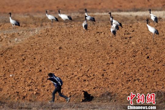 1月6日,云南昭通大山包黑颈鹤保护区,壹名回家的の少年欲与黑颈鹤齐飞。中新社发 盛佳鹏 摄