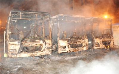 凌晨暖车线路短路 哈尔滨3辆公交车烧成空壳(图) |