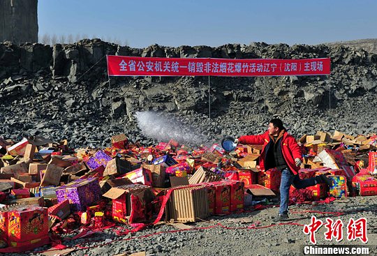 1月15日,辽宁省集中销毁烟花爆竹活动在沈阳新民市梁山镇采石场举行,现场共销毁3300余件非法烟花爆竹。图为销毁现场。中新社发 于海洋 摄