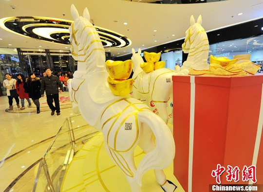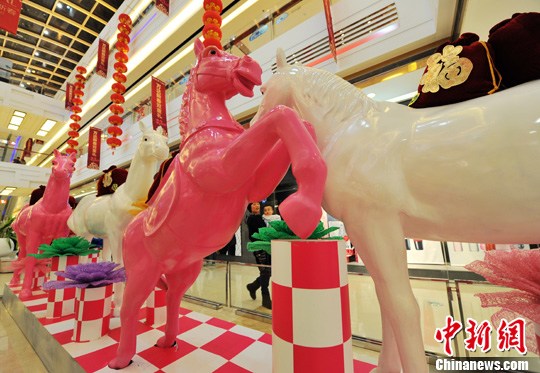 2月6日,福州市区壹商场内摆放着各种“马上有钱”、“马上有福”、“马到成功”等马雕塑。中新社发 张斌 摄