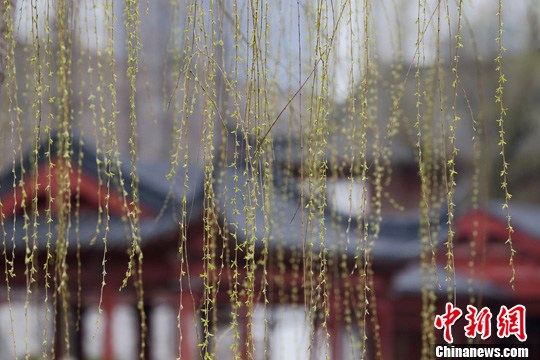 玄武湖畔发芽的の柳叶随风飘荡。中新社发 泱波 摄