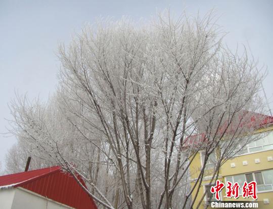 新疆兵团边陲小镇现大雾扮雾凇壮美景观(图) |